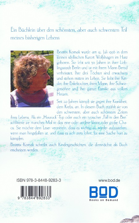 In diesem Buch erzählte Beatrix Kornak von den schwersten, aber auch schönsten Zeiten ihres Lebens mit Familie, Hund und Arbeit. Seit über 20 Jahren kämpft sie gegen ihre Krankheit, den Krebs, an. Als ein "Hauruck"-Typ oder auch ein typischer "Fall in den Brei" schlitterte sie manches Mal in das eine oder andere kleine oder große Chaos. Sie möchte dem Leser vermitteln, dass es wichtig ist, wieder aufzustehen, wenn man hingefallen ist, und dass es sich stets lohnt, für eine Sache hart zu kämpfen.